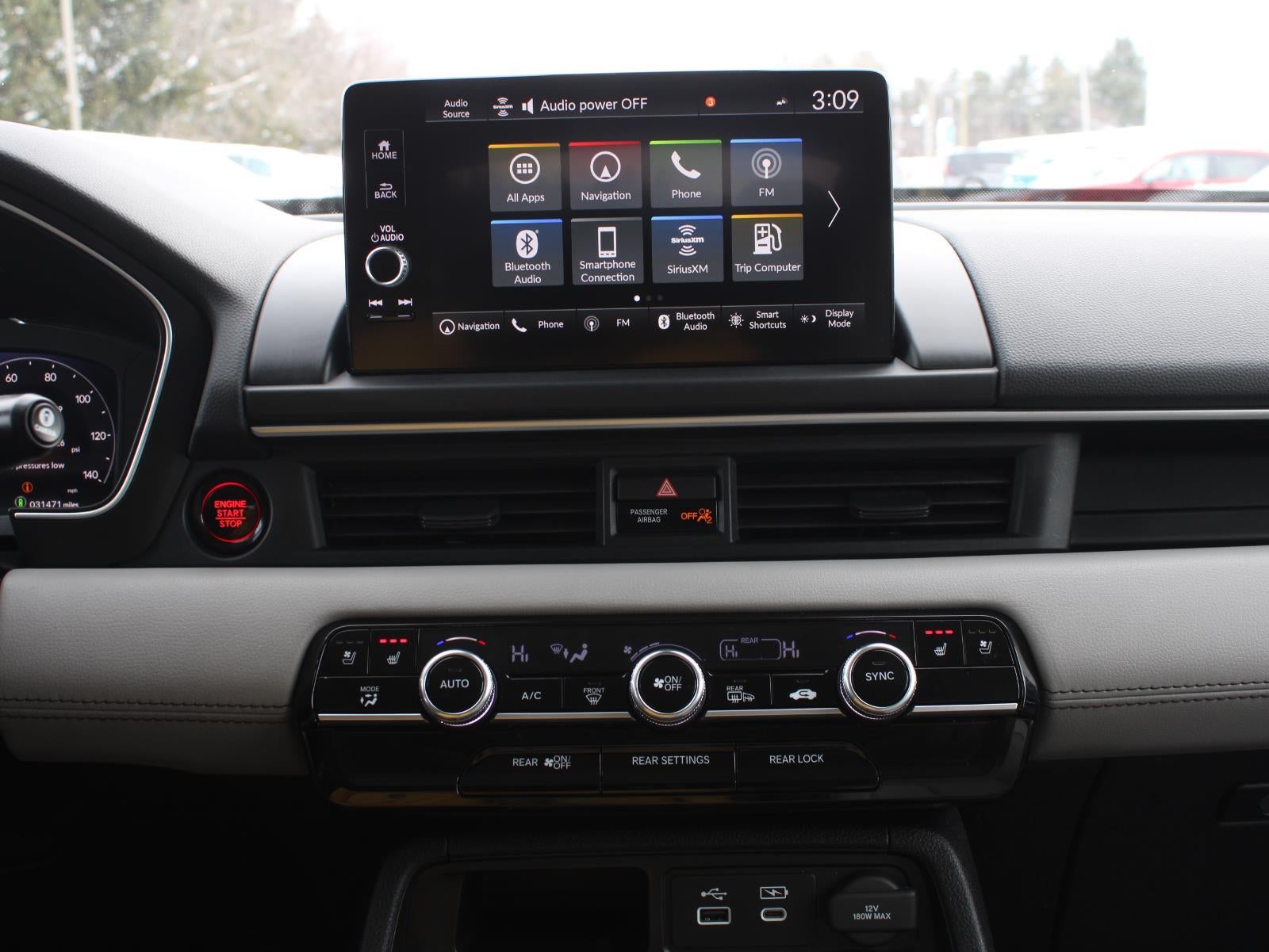 - Radio: Bose Premium Sound System -inc: 12 speakers w/subwoofer, 9" color touchscreen, Bluetooth® HandsFreeLink and streaming audio, Radio Data System (RDS), Speed-sensitive Volume Compensation (SVC), front 12-volt power outlet, wireless Apple CarPlay and Android Auto compatibility, Wi-Fi hotspot capability, Qi wireless phone charger, SMS text message function, SiriusXM (SiriusXM requires a subscription after any trial period, If you decide to continue your SiriusXM service at the end of your trial subscription, the plan you choose will automatically renew and bill at then-current rates until you call SiriusXM at 1-866-635-2349 to cancel, See our customer agreement for complete terms at www.siriusxm.com, Fees and programming subject to change, Available in the 48 contiguous United States and D.C, SiriusXM and all related marks and logos are trademarks of SiriusXM Radio Inc.), HD Radio, 2.5-amp USB type-A smartphone/audio interface port in front console, 3.0-amp USB type-C charging port in front console, Honda Satellite-Linked Navigation System w/voice recognition and Honda Real-Time Traffic (The Honda Satellite-Linked Navigation System functions in the United States (not including territories, except Puerto Rico) and Canada, Honda HD Digital Traffic service is only available in the United States, except Alaska, Please see your Honda dealer for details.), HondaLink subscription services ( complimentary trials of security for 1 year and a remote/concierge trial for 3 months, Enrollment is required to access the remote/concierge trial and to access certain features of security, At the end of each trial period, purchase of a subscription is required to continue the respective services.), multi-zone audio and CabinTalk in-car PA system